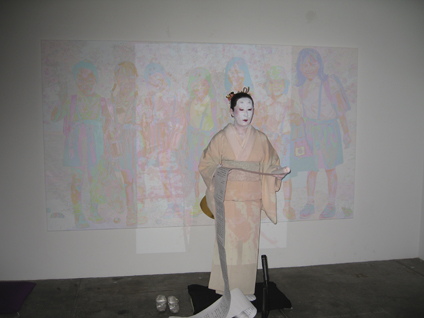 Vestita con il tradizionale abito da cerimonia giapponese, Karasumaru intende trasformare il recital in una sorta di rituale: il kimono bianco – colore che identifica il lutto – viene infatti equiparato a una tela intonsa e/o a uno schermo diafano su cui vengono proiettate immagini della cultura pop nipponica, attingendo in particolar modo ai Manga e agli Anime.