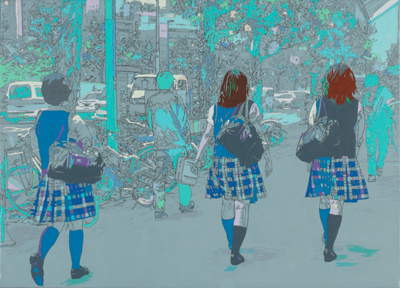 Her paintings are created from photographic images, often taken by the artist herself, in which family portraits, teenagers in the street in the quarters of Tokyo where young people hang out such as Shibuya, Harajyuku, Ginza interchange with urban views of Tokyo, she shows also " Tokyo landscape series.