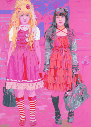 POP DESIGN now collaborates with the painter and performance artist YUMI KARASUMARU and presents their new wristwatch ‘The Dolls Pappwatch’, as a limited edition of only 100 pieces, featuring the two standing Harajuku girls from her art piece The Dolls (2014, 70 x 50 cm, Indian ink, pencil and acrylic on canvas).